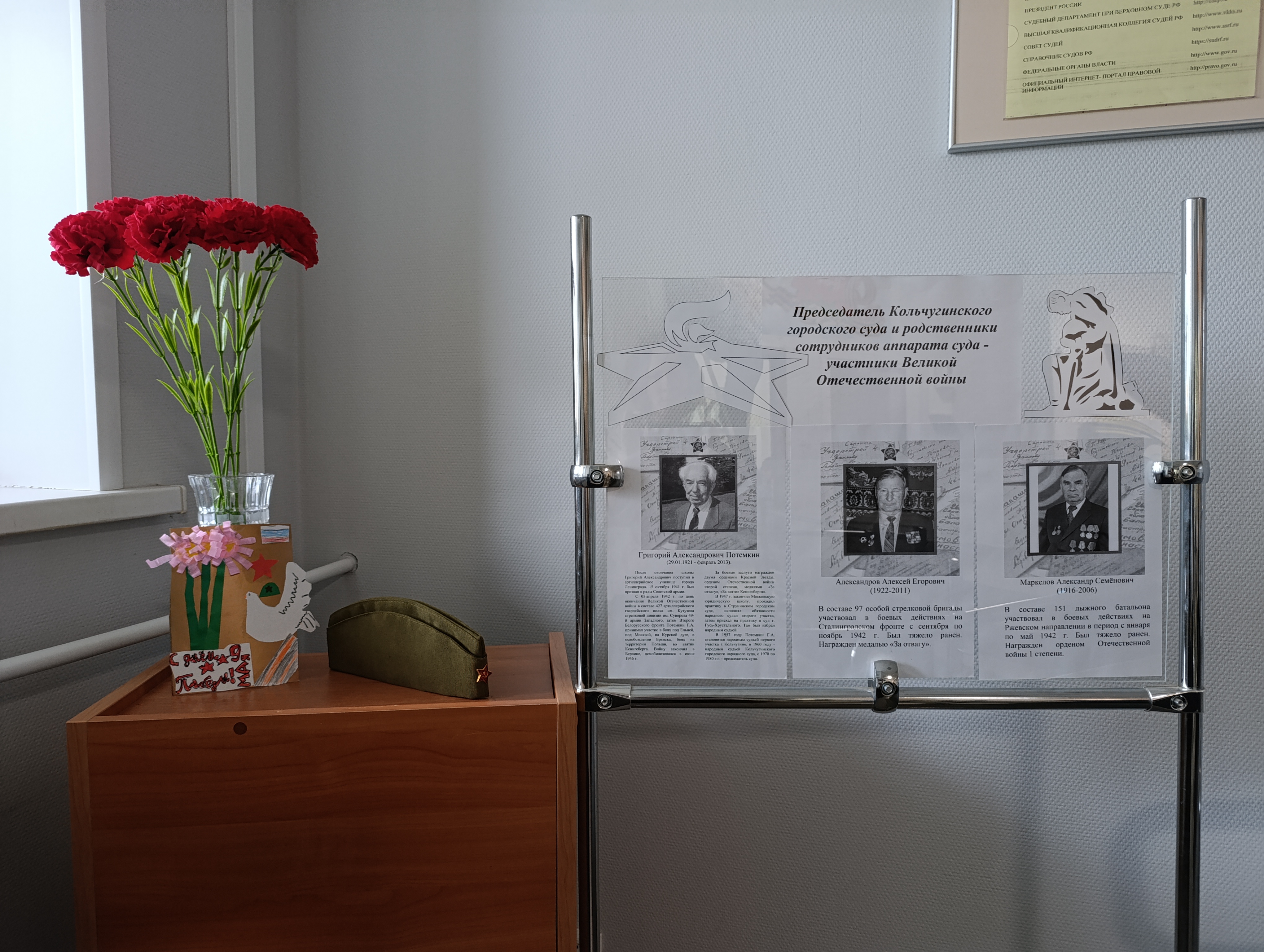 Великая Отечественная война стала одной из самых кровопролитных войн в истории человечества и одной из самых важных и значимых в истории России. Это беспрецедентный пример стойкости и мужества советского народа, огромной любви к своей Родине. Вся страна, движимая патриотизмом и чувством долга, встала на защиту своей родной земли и людей, которые на ней жили. В эти страшные годы наши люди делали то, что казалось невозможным. И воины, отстаивавшие нашу свободу на поле боя, и труженики тыла, ковавшие Победу на заводах, - все, кто выступил на защиту страны, достойны называться героями. Приближается великий праздник - День Победы. В этом году исполняется ровно 80 лет с того великого дня - 9 Мая 1945 года. Мы помним события и героев тех лет, чтим и уважаем то, что они сделали, гордимся подвигами простого народа, своих родственников, принимавших участие в защите Родины. Память о подвиге советских солдат навсегда останется в наших сердцах, время не будет властно над ней. И наш с вами долг как их потомков - помнить их подвиг и чтить их память. Пока мы помним и чтим своих героев– их жертва не была напрасной, Победа будет жить вечно. В преддверии этого великого события в фойе Кольчугинского городского суда оформлен стенд с фотографиями служителей Фемиды и родственников сотрудников аппарата суда - участников Великой Отечественной войны. Объединенная пресс-служба судов общей юрисдикции 8 (49245) 2-58-50 ![]() |